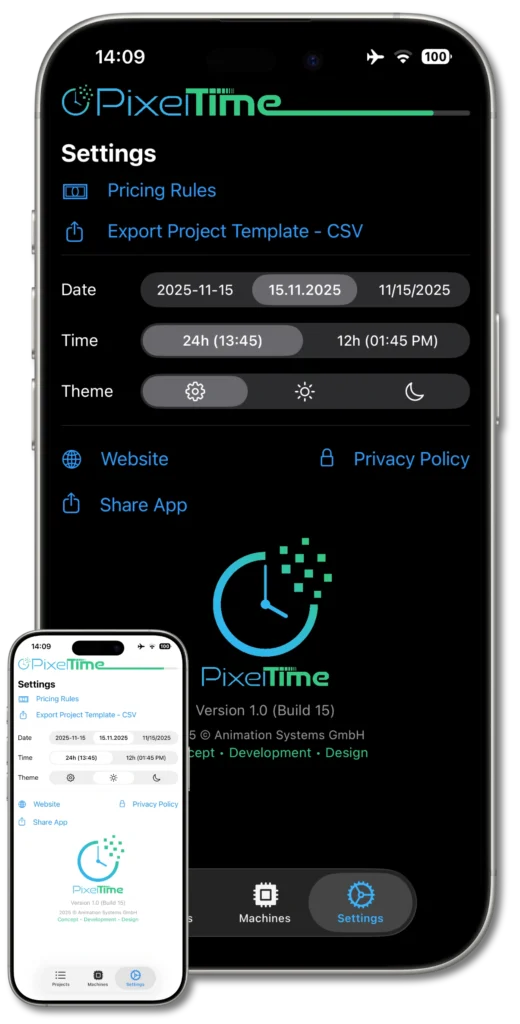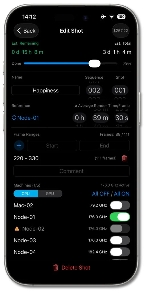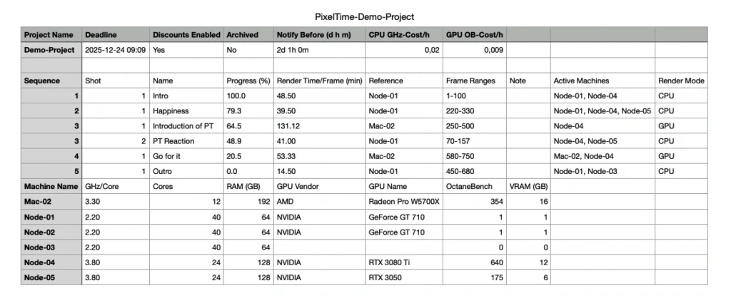 Define frame ranges, assign machines and let PixelTime calculate time and cost automatically